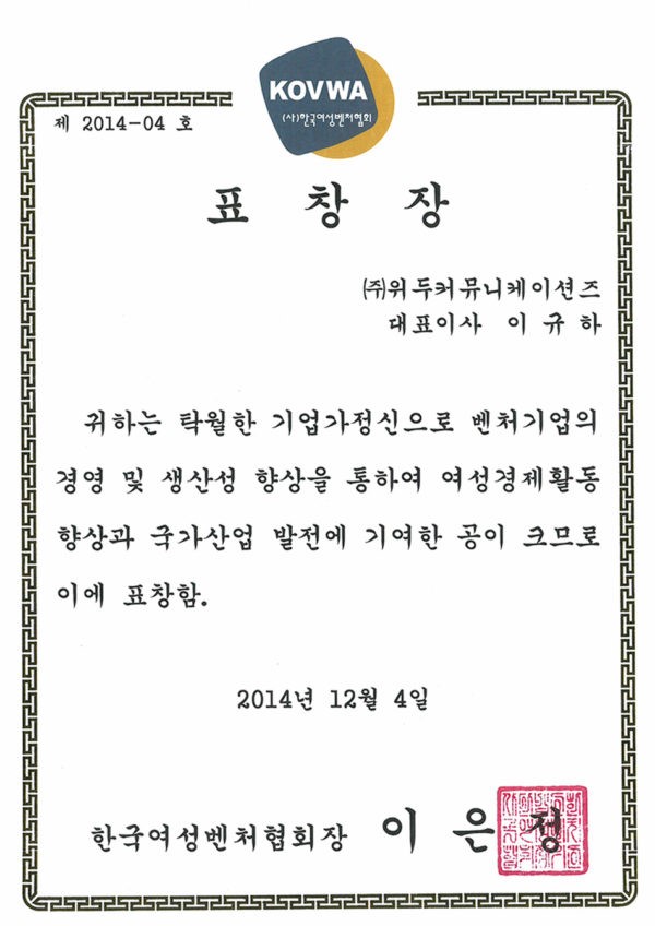 Korea Venture Business Womens Association Award Certificate