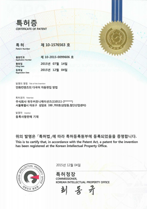 [한국/특허] 만화 컨텐츠의 다국어 자동 편집 방법 페이지 정보 작성자 WeDu 댓글 0건 조회 5,256회 작성일 19-05-30 18:49 본문 2015-07-14 특허 10-2015-0099606 만화 컨텐츠의 다국어 자동 편집 방법 List Previous[한국/특허] 전자서적과 연동되는 게임의 제공 장치 19.05.30