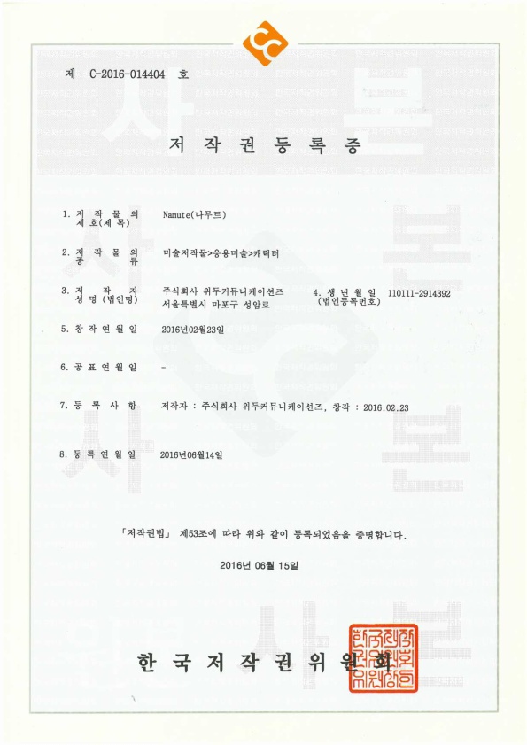 [한국/저작권] 나무트 페이지 정보 작성자 WeDu 댓글 0건 조회 5,086회 작성일 19-05-30 19:08 본문 2016-06-14 저작권 C-2016-014404 나무트 / 미술저작물>응용미술>캐릭터 List Previous[한국/저작권] 리안 19.05.30 Next[한국/저작권] 길리 19.05.30