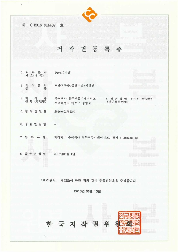 [한국/저작권] 파벨 페이지 정보 작성자 WeDu 댓글 0건 조회 4,982회 작성일 19-05-30 19:11 본문 2016-06-15 저작권 C-2016-014402 파벨 / 미술저작물>응용미술>캐릭터 List Previous[한국/저작권] 누미 19.05.30 Next[한국/저작권] 월터 19.05.30