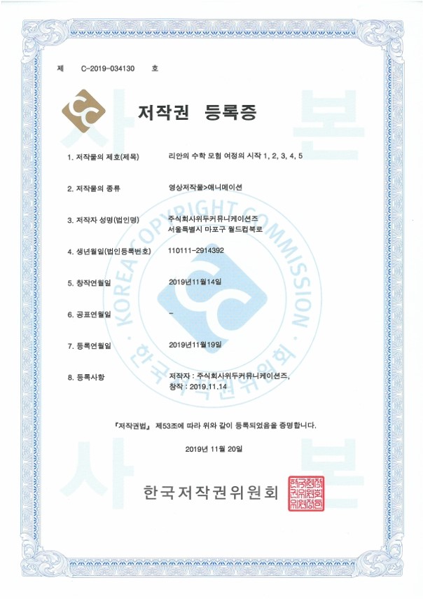 [한국/저작권] 리안의 수학 모험 여정의 시작 1,2,3,4,5 페이지 정보 작성자 WeDu 댓글 0건 조회 4,772회 작성일 21-12-31 12:36 본문 2019-11-20 저작권 C-2019-034130 영상저작물>애니메이션 List Previous[한국/저작권] OLL KIDS/MATH 21.12.31 Next[한국/저작권] 리안의 수학 모험 애니메이션 OST 19.11.25