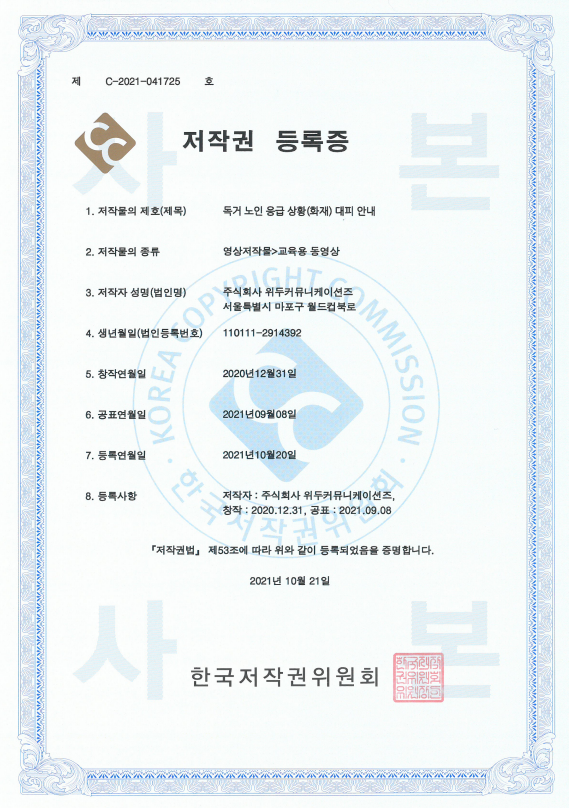 [한국/저작권] 독거 노인 응급 상황(화재) 대피 안내 페이지 정보 작성자 WeDu 댓글 0건 조회 5,168회 작성일 21-12-31 12:41 본문 2021-10-21 저작권 C-2021-041725 영상저작물>교육용 동영상 List Previous[한국/저작권] 장보기 인지훈련 게임 21.12.31 Next[한국/저작권] OLL KIDS/MATH 21.12.31