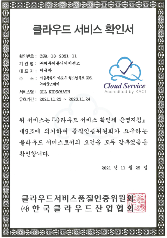 [한국/인증서] OLL KIDS/MATH 클라우드 서비스 확인서 페이지 정보 작성자 WeDu 댓글 0건 조회 8,007회 작성일 21-12-31 12:46 본문 2021-11-25 확인번호 CSA-18-2021-11 서비스명 : OLL KIDS/MATH List Previous[한국/확인서] OLL KIDS/MATH 파스-타 호환성 확인서 21.12.31 Next[한국/저작권] 장보기 인지훈련 게임 21.12.31