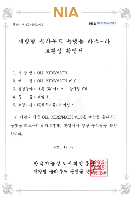 [한국/확인서] OLL KIDS/MATH 파스-타 호환성 확인서 페이지 정보 작성자 WeDu 댓글 0건 조회 8,338회 작성일 21-12-31 12:48 본문 2021-12-29 확인서 제 SC-2021-09 점검분야 : 호환 SW서비스 - 탑재형 SW List Next[한국/인증서] OLL KIDS/MATH 클라우드 서비스 확인서 21.12.31